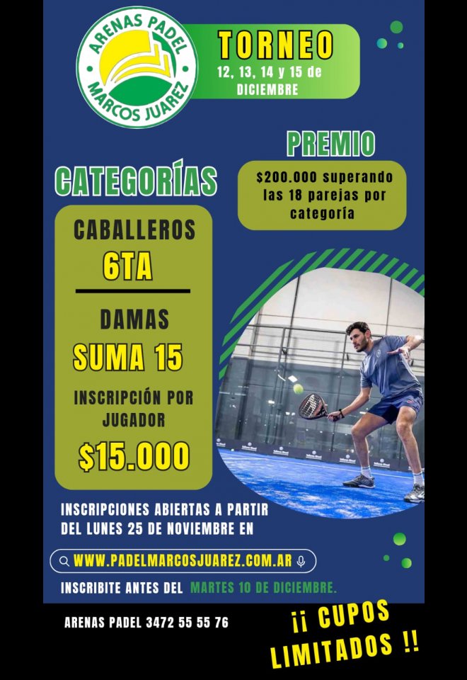 »» Evento: Torneo suma 15 damas y 6ta caballeros »» Localidad: Marcos Juárez »» Fechas: 12/12/2024 al 15/12/2024
